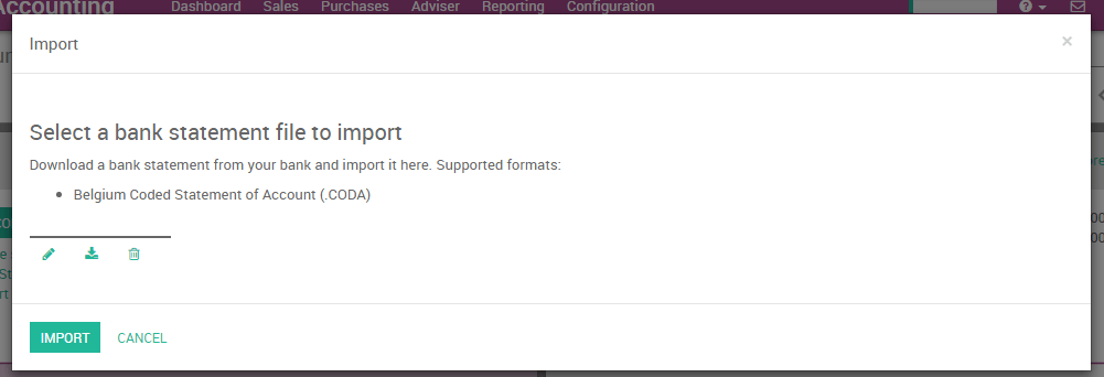 Cargue el archivo de CODA en la siguiente pantalla y haga clic en Importar para crear todos sus estados de cuenta bancarios.