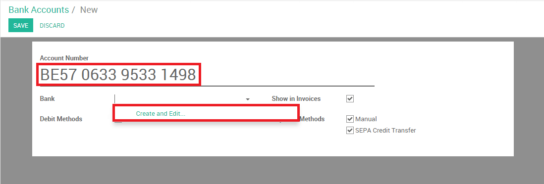 Antes de poder registrar una transferenica interna, necesitamos agregar un nuevo banco a nuestro panel de contabilidad. Para hacer esto, ingrese al módulo de contabilidad y haga click en Ajustes ‣ Cuentas Bancarias. Cree una nueva cuenta bancaria. Deberia llenar el campo Numero de Cuenta. Tambien puede crear y editar su banco para especificar los detalles correspondientes.