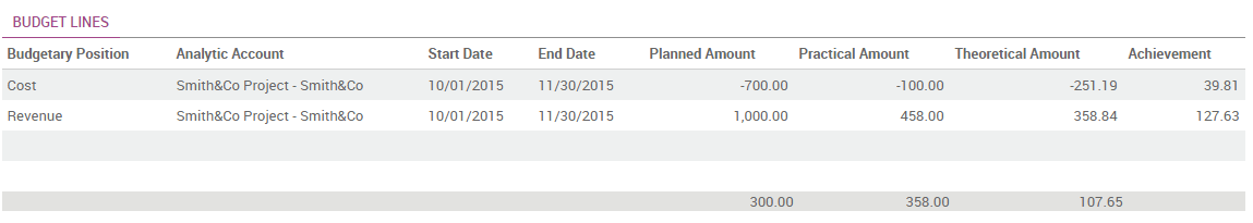 Por medio de la cuenta analítica, Odoo puede considerar las líneas de factura y las líneas de compra reservadas en las cuentas y las mostrará en la columna Monto Práctico.