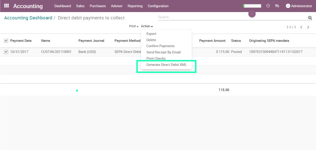 You select the payments in the list that you want to include in your SDD File, click on action and select "Generate Direct Debit XML".