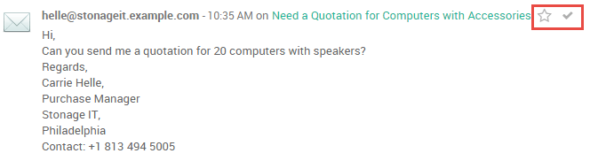 Marking an item with a check marks the message as read and removes it from your inbox. If you would like to save an item for future reference or action, mark it with a star to add it to the Starred box. You can star any message or notification in Discuss or any of the item-specific chatters throughout Odoo to keep tabs on it here.