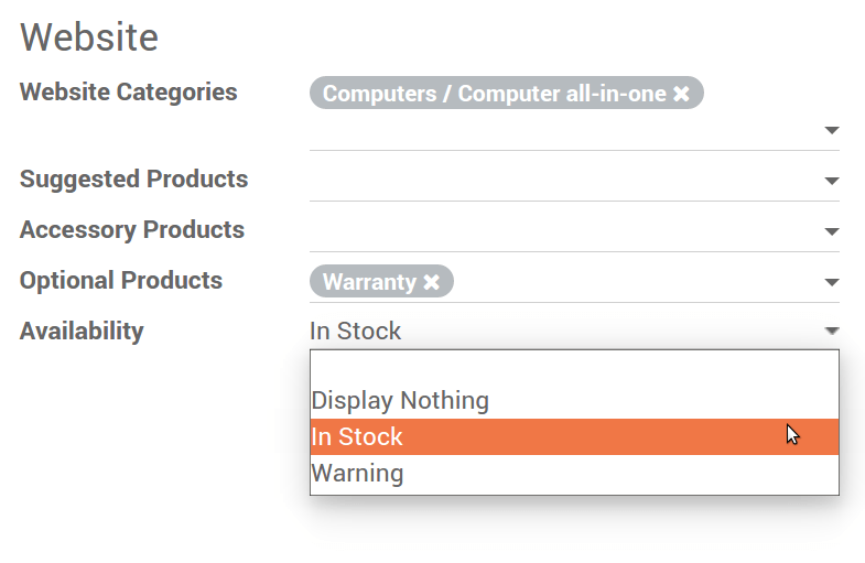 Para visualizar esto, abre la pestaña Ventas en el formulario de detalle del producto y selecciona una opción en Disponibilidad.