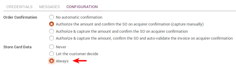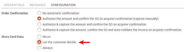 To ease the payment of returning customers, you can let them save and reuse a credit card if they want to. If so, a payment token will be saved in Odoo. This option is available with Ingenico and Authorize.net.