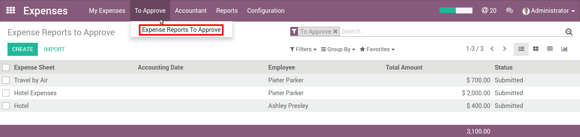 HR and team managers get an overview of all expense reports to validate from the top menu . Such users must have at least Officers access rights for Expenses.