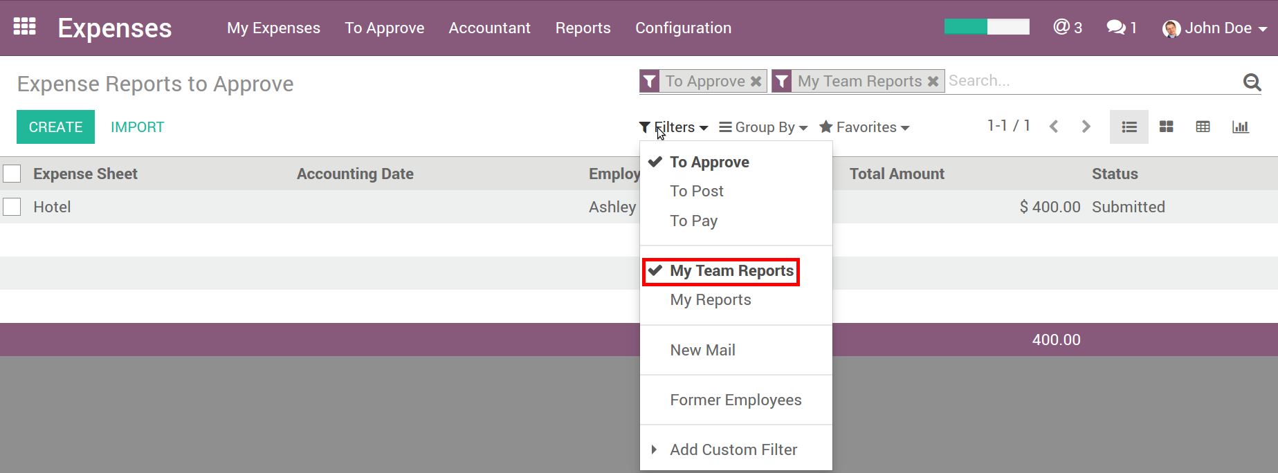 As a team manager you can easily find the expense reports of your team members. You need to be set as manager in the detail form of those employees.