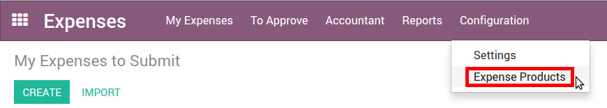 The first step to track expenses is to configure the expense types (managed as products in Odoo) that your company allows, from the Configuration menu. When a specific expense is reimbursed at a fixed price, set a cost on the product. Otherwise keep the cost at 0.0 and employees will report the real cost per expense.