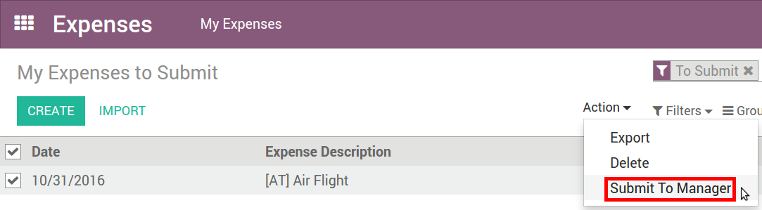 When you are ready to submit your expenses to your manager (e.g. at the end of a business trip, or once a month), go to the menu . Select all expenses from the list view and click on . Save the newly created expense report (i.e. set of expenses), and wait for your manager to approve it.