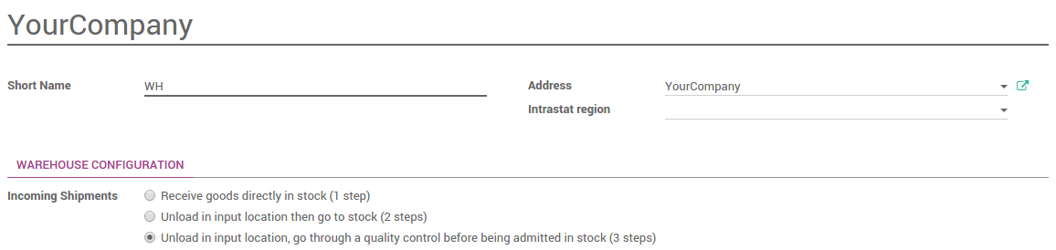 Por defecto, las bodegas están configuradas con la recepción de un paso (Recibir mercancías directamente en existencias).