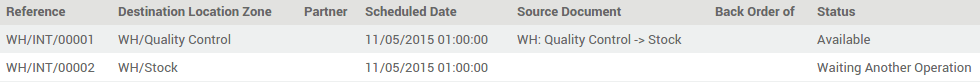En este ejemplo, otro movimiento esta en espera de acuerdo con la segunda regla de impulso, la cual define cuando esta listo el control de calidad, la mercancía será movida al inventario principal.