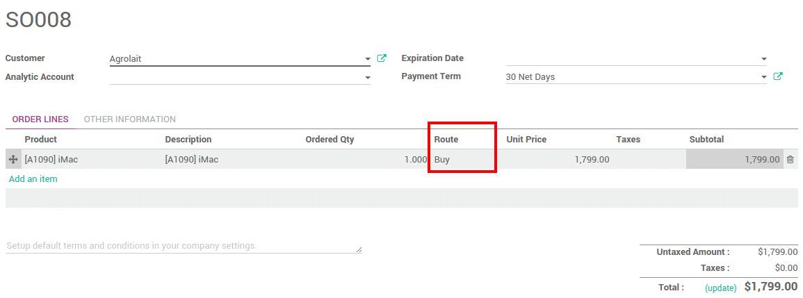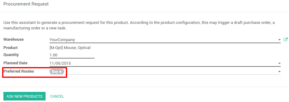 Si trabaja sin inventario, o con reglas de inventario mínimo, es mejor usar la ruta Fabricar bajo Pedido. Combinela con la ruta Comprar o Fabricar y automáticamente accionará la órden de compra o la Órden de Producción cuando sus productos estén agotados.