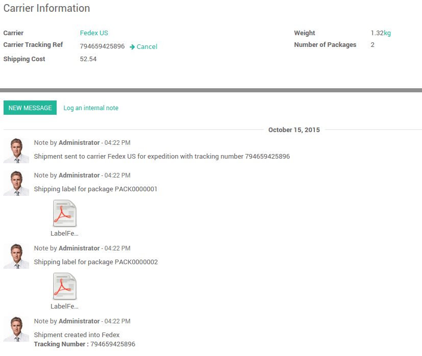 Por defecto, Odoo considera que su entrega esta compuesta de un paquete. Pero Ud. puede fácilmente enviar sus entregas con mas de un paquete. Esta totalmente integrado con los terceros transportistas.