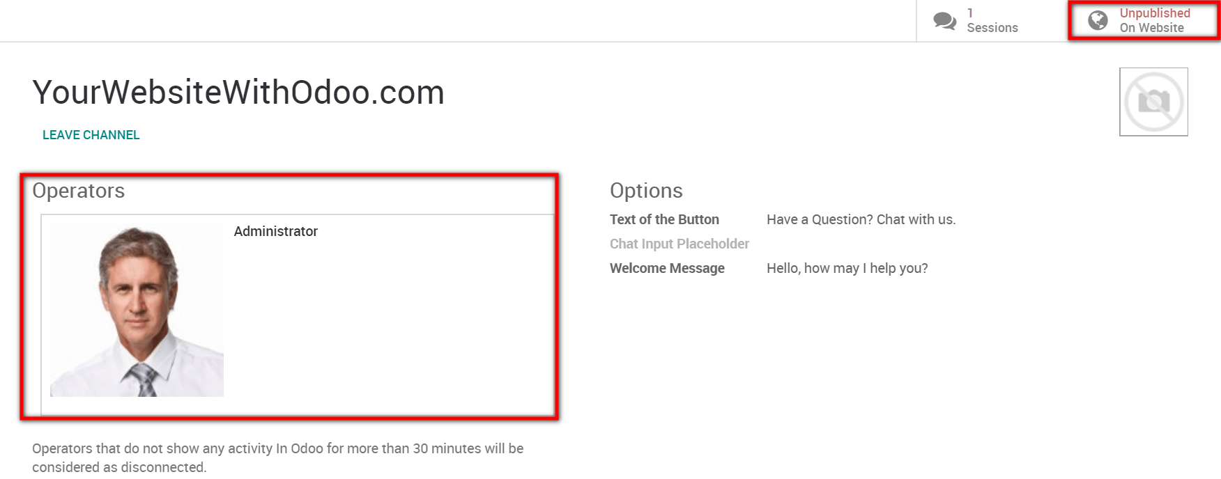 Para comenzar a chatear con los clientes, primero asegúrese de que el canal esté publicado en su sitio web. Para hacerlo, seleccione No publicado en el sitio web en la esquina superior derecha del formulario del canal para alternar la configuración Publicado. Luego, el chat en vivo puede comenzar una vez que un operador se haya unido al canal.