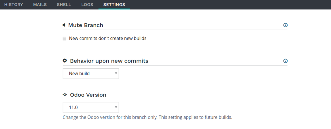 The production branch has no settings. It can't be muted, will always update the existing production database and will run on the project's version of Odoo. If you want to upgrade your production to a newer version please refer to the Upgrade section.