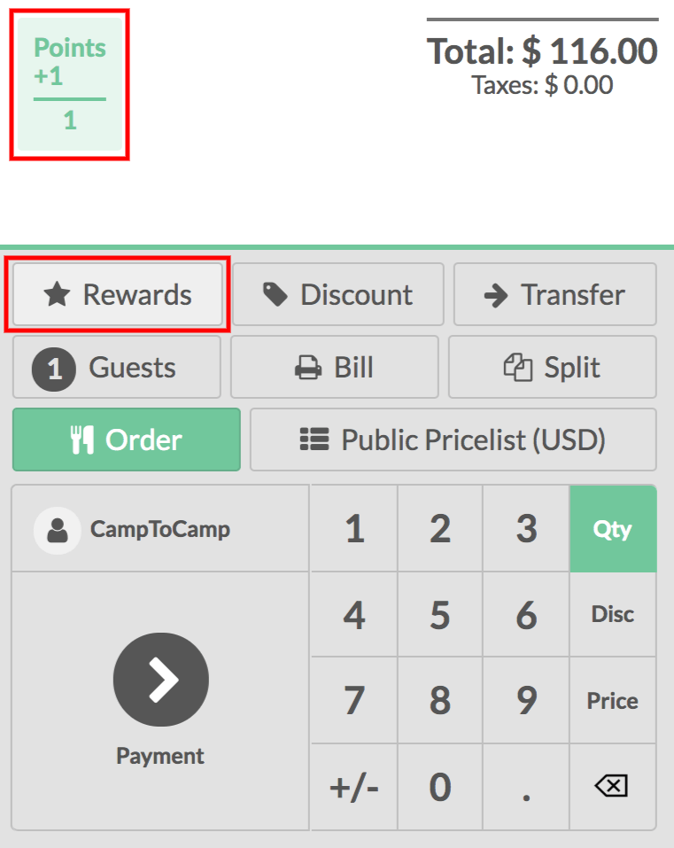 Cuando se establece un cliente, ahora verá los puntos que obtendrá por la transacción y se acumularán hasta que se gasten. Se gastan usando el botón Recompensas cuando tienen suficientes puntos de acuerdo con las reglas definidas en el programa de lealtad.