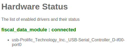 Con el fin de utilizar Un Módulos de Datos fiscales, usted necesitará un POSBox registarado. Esos POSBox son similares a los POSBox regulares que nosotros vendemos, pero están registrado con el nombre del gobierno belga. Eso es requerido por las ley. Al intentar usar un Módulo de Datos Fiscales en un POSBox no registrado no funcionará. Puede verificar que el Módulo Fiscal de Datos es reconocido por POSBox a través de ir a la ** Página de Hardware* mediante la páginaweb POSBox.