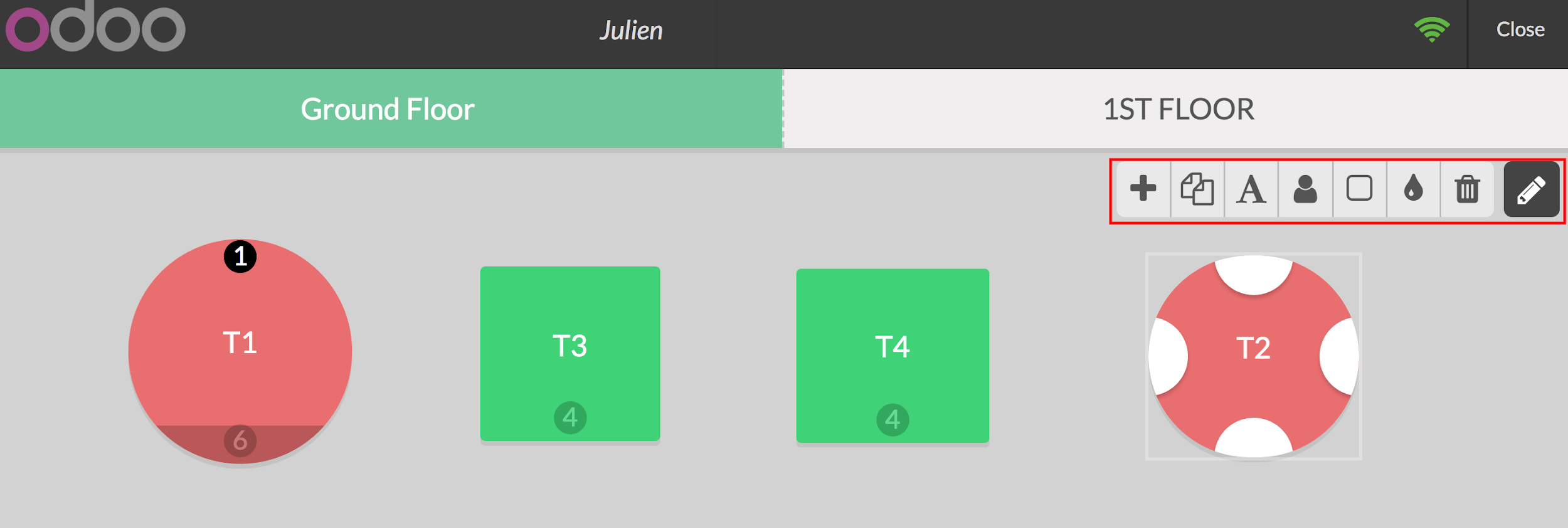 When you click on the pencil you will enter into edit mode, which will allow you to create tables, move them, modify them, ...