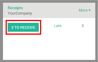Si ha adquirido cualquier producto almacenable que administra el inventario, tendrá que recibir los productos desde el módulo de Almacén después de que usted confirme una orden de compra. Desde el tablero de Almacén, debería ver un botón que une directamente a la transferencia de productos. Este botón se indica en rojo a continuación: