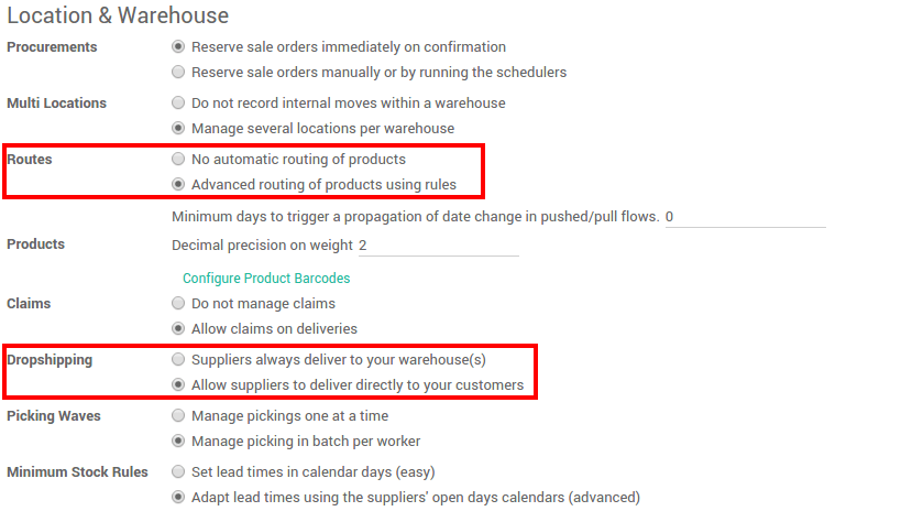 En primer lugar, configurar las Rutas y Dropshipping. Ir a :menuselection:[UNKNOWN NODE problematic]Inventario --> Configuración --> Ajustes. Compruebe Las rutas avanzadas de los productos utilizando reglas en la sección de Rutas y en Permitir a los proveedores para entregar directamente a sus clientes en la sección de Dropshipping.