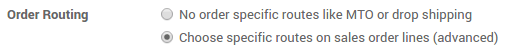 Usted tiene que permitir la elección de la ruta en el orden de venta. Ir a el módulo de Ventas, Configuración ‣ Ajustes y seleccione Elegir rutas específicas en las líneas de órdenes de venta (avanzadas).