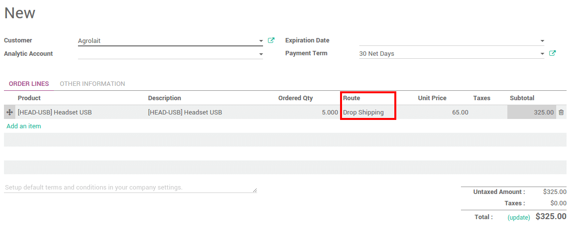 Crea la orden de venta y selecciona la ruta como Dropshipping en las líneas de la orden en cuestión.