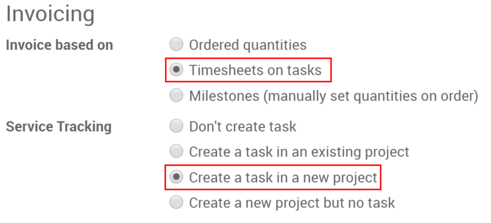 Desde una página de producto configurado como servicio, encontrará dos opciones en la pestaña de contabilidad, seleccione Hojas de horas en las tareas y Crear una tarea en un nuevo proyecto.