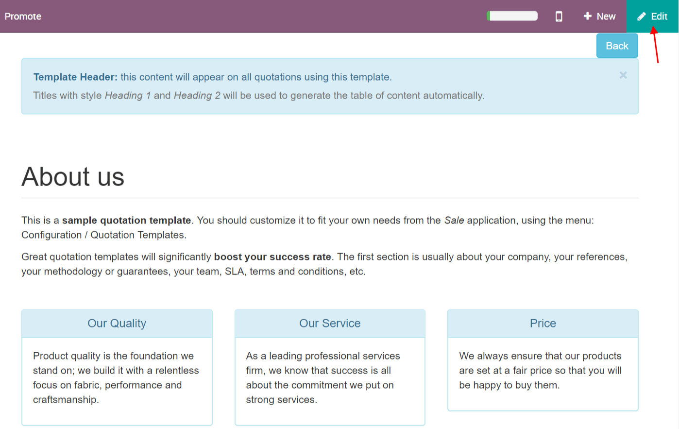 Puedes editar la interfaz de cliente de la plantilla que ven para aceptar o pagar la cotización. Esto te permite describir tu empresa, servicios y productos. Cuando hagas clic en * Editar plantilla [UNKNOWN NODE problematic], aparecerá el editor de presupuestos.