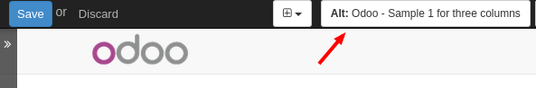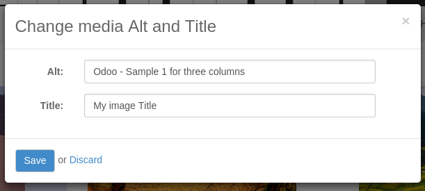 Si hace clic en una imagen, Odoo le muestra los attributos Alt y título de la etiqueta <img> . Puede dar cic para configurar su propio attributo título y Alt para la imagen.