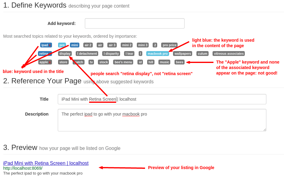 Cada página web debe definir la metadata <título>, <descripción> y <palabras clave>. Estos elementos de información son usados por los motores de búsqueda para clasificar y categorizar su página web de acuerdo a consultas de búsqueda específicas. Entonces, es importante tener títulos y palabras clave en línea con lo que la gente busca en Google.