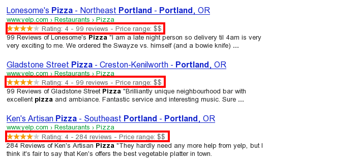 Google soporta un número de fragmentos enriquecidos por tipos de contenido, incluyendo: Revisiones, Gente, Productos, Negocios, Eventos y Organizaciones.